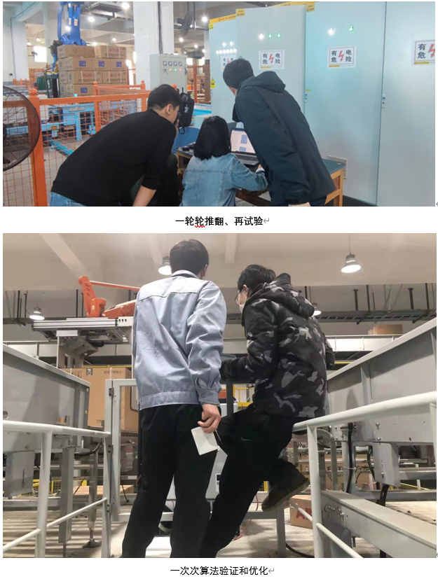針對這一創(chuàng)新理念,在物流碼垛行業(yè)幾乎是空白,團(tuán)隊(duì)成員可借鑒的成功經(jīng)驗(yàn)不多,所有的工作都要從零開始。萬事開頭難,項(xiàng)目組成立以后,迅速分工協(xié)作、開展工作。團(tuán)隊(duì)成員根據(jù)已有經(jīng)驗(yàn)和問題導(dǎo)向,咨詢業(yè)內(nèi)專家分析可行性,提出多種大膽想法,一遍遍地設(shè)計(jì)驗(yàn)證,一次次地推倒重來。從創(chuàng)意的雛形初定到最終柔性碼垛方案的完成,中間經(jīng)歷了無數(shù)波折與困難。那段時(shí)間,團(tuán)隊(duì)成員晚上加班編程,白天現(xiàn)場驗(yàn)證,頂住了巨大的壓力,一路奮斗協(xié)作,“創(chuàng)新之火”在團(tuán)隊(duì)成員心中熊熊燃燒!