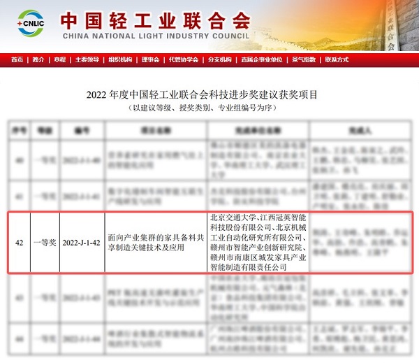 近日,中國輕工業(yè)聯(lián)合會在官網(wǎng)發(fā)布了經(jīng)評審?fù)ㄟ^的“2022年度中國輕工業(yè)聯(lián)合會科學(xué)技術(shù)獎建議獲獎項目”名單。北京機械工業(yè)自動化研究所有限公司(簡稱北自所)參與完成的《面向產(chǎn)業(yè)集群的家具備料共享制造關(guān)鍵技術(shù)與應(yīng)用》項目,榮獲2022年度中國輕工業(yè)聯(lián)合會科技進步一等獎。