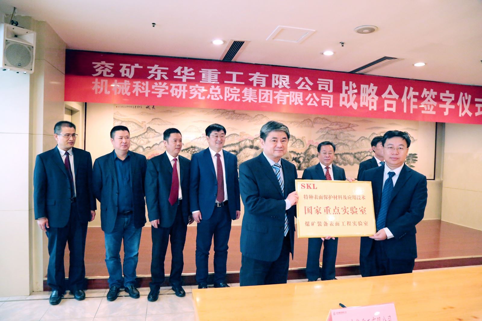特種表面保護材料及應用技術國家重點實驗室在東華重工設立煤礦裝備表面工程實驗室,材保所總經理吳勇授牌,趙峰代表東華重工接牌。